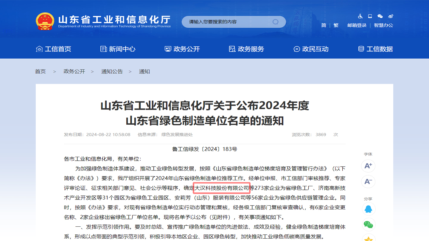 近日,在山东省工业和信息化厅公布的《2024年度山东省绿色制造单位名单的通知》中确定米兰网站_米兰(中国)官方等企业为省绿色工厂。《中国制造2025》明确将绿色发展作...